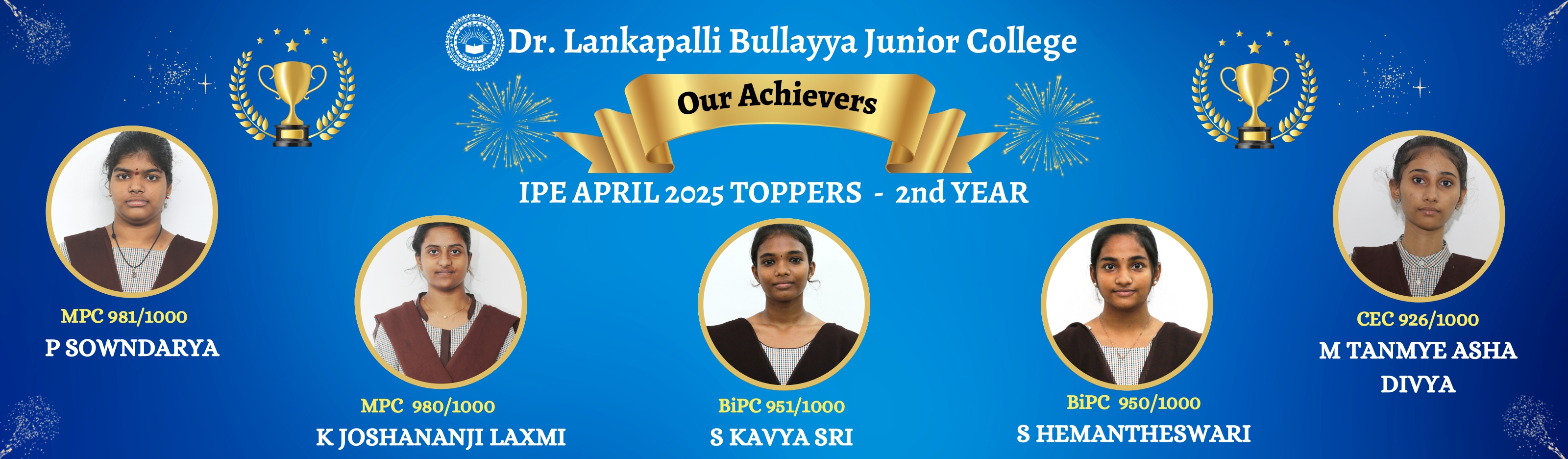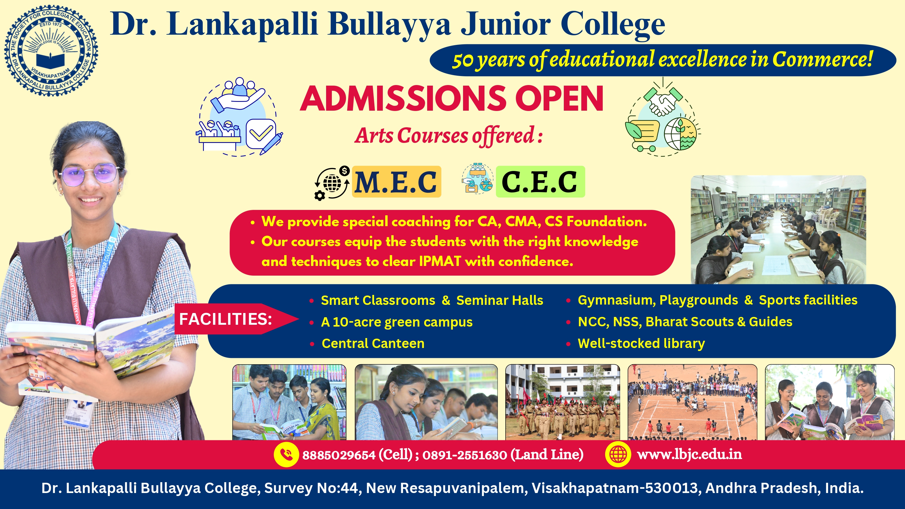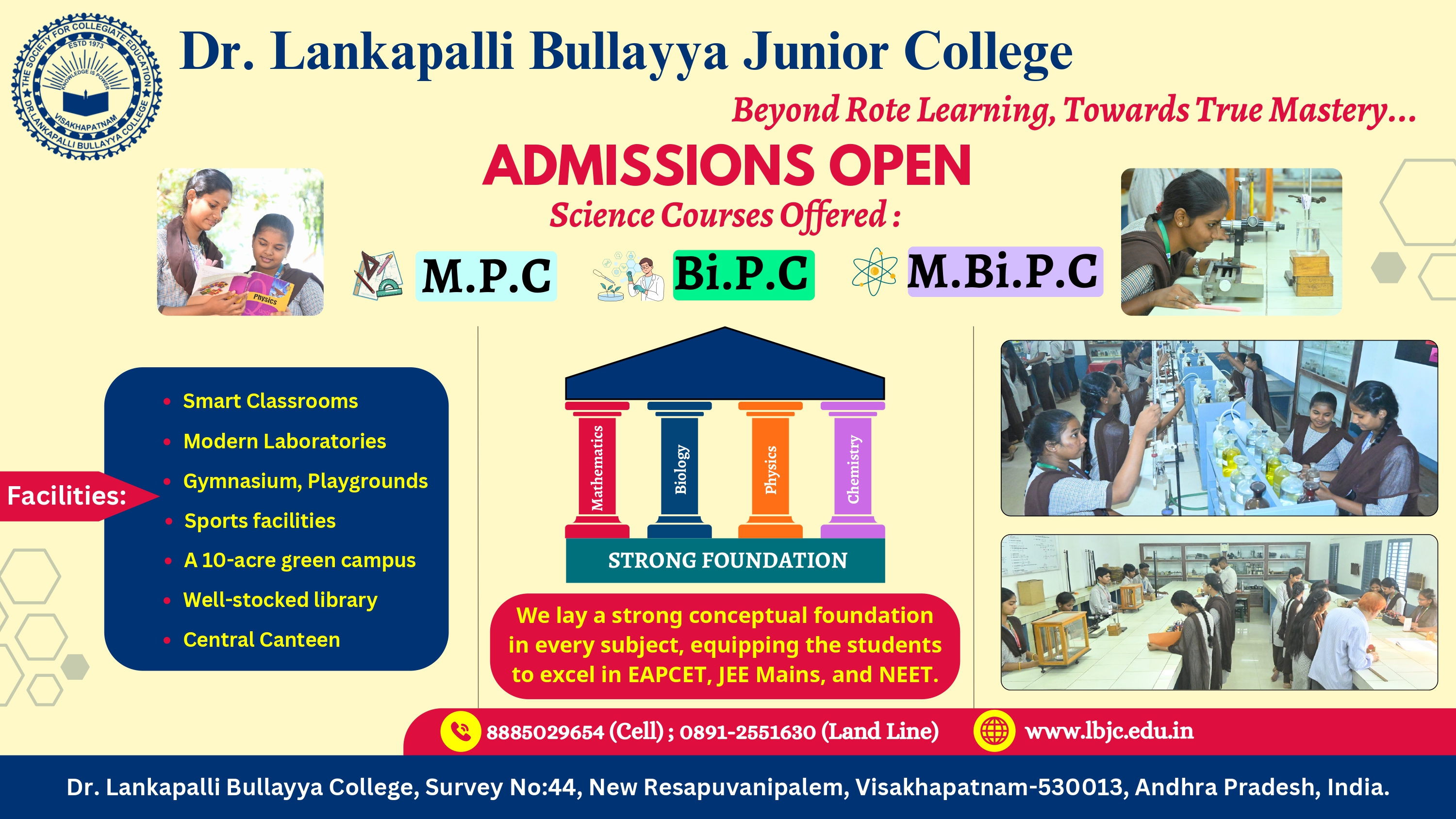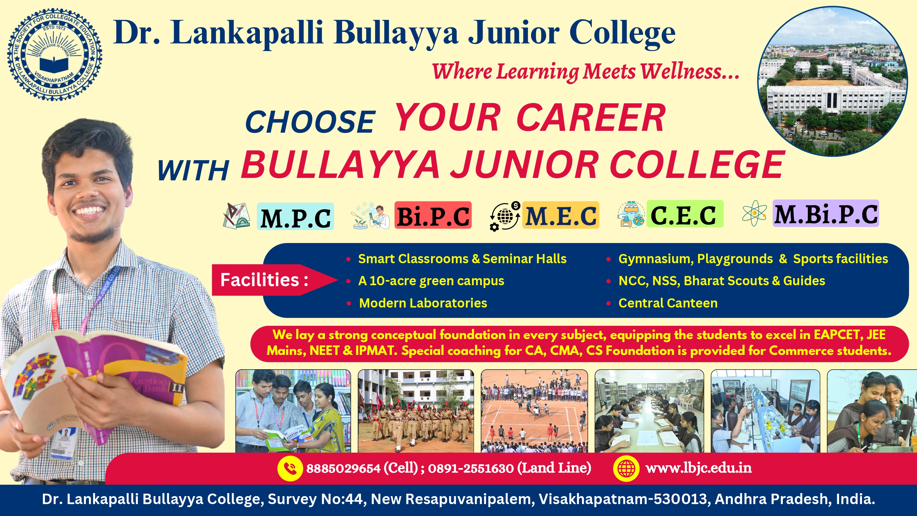 Dr. Lankapalli Bullayya Junior College was established in 1978 by the Society for Collegiate Education to fulfill the educational needs in the North Coastal Districts of Andhra Pradesh. The College is recognized by the Board of Intermediate Education.